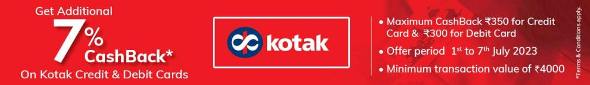 7% Cashback (maximum 350 for Kotak Bank Credit Card & 300 for Kotak Bank Debit Card) on regular card swipe – net purchase value of minimum 4000 at DMart Stores, DMart Ready & DMart miniMAX.
